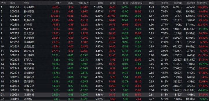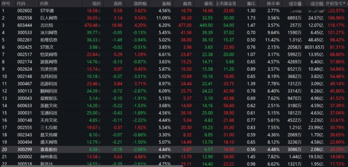 截至收盘,巨人网络(002558.SZ)涨超9%,神州泰岳(300002.SZ)、吉比特(603444.SH)涨超4%,迅游科技(300467.SZ)、ST华通(002602.SZ)涨超3%,*ST大晟(600892.SH)、三七互娱(002555.SZ)、恺英网络(002517.SZ)纷纷跟涨。